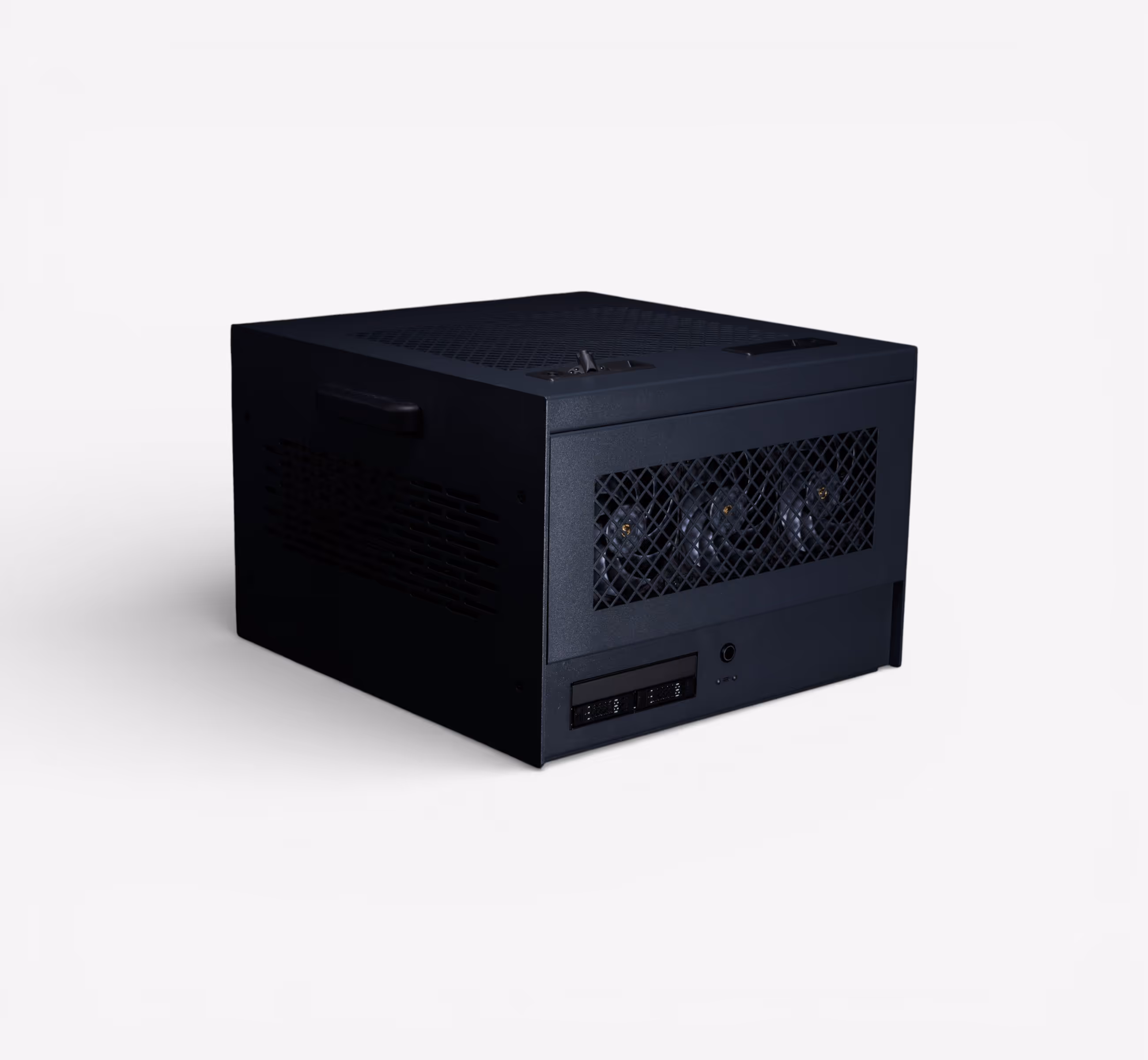 The smallest desktop in the fleet with full RTX 5090 power. Ryzen 9 9900X3D with 3D V-Cache for exceptional single-thread performance, 64GB DDR5, and 2TB NVMe in a compact steel SFF chassis measuring 37.2 x 18.5 x 29.2cm (14.6" x 7.3" x 11.5") and weighing just 4.4kg (9.8 lbs). Front I/O includes 2x USB 3.0, 1x USB-C, and audio out. Supports up to 334mm GPU length with 2x top and 2x bottom 120mm fan mounts.